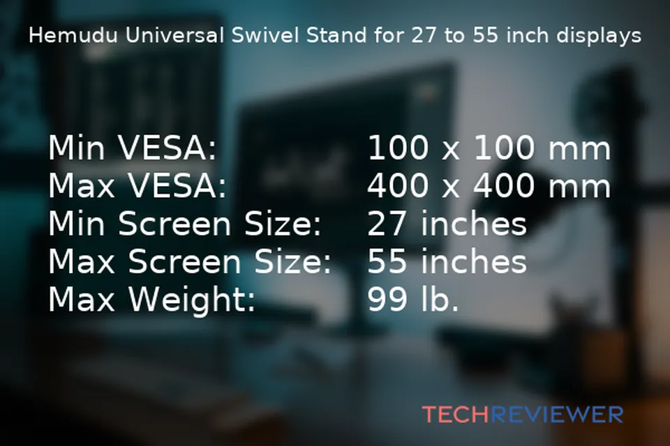 Hemudu Universal Swivel Stand for 27 to 55 inch displays Min VESA: 100 x 100 mm Max VESA: 400 x 400 mm Min Screen Size: 27 inches Max Screen Size: 55 inches Max Weight: 99 lb. The mount, designed for VESA sizes between 100 x 100 and 400 x 400, works well with the Samsung 27" Odyssey G7 monitor that requires a 100 x 100 VESA size.